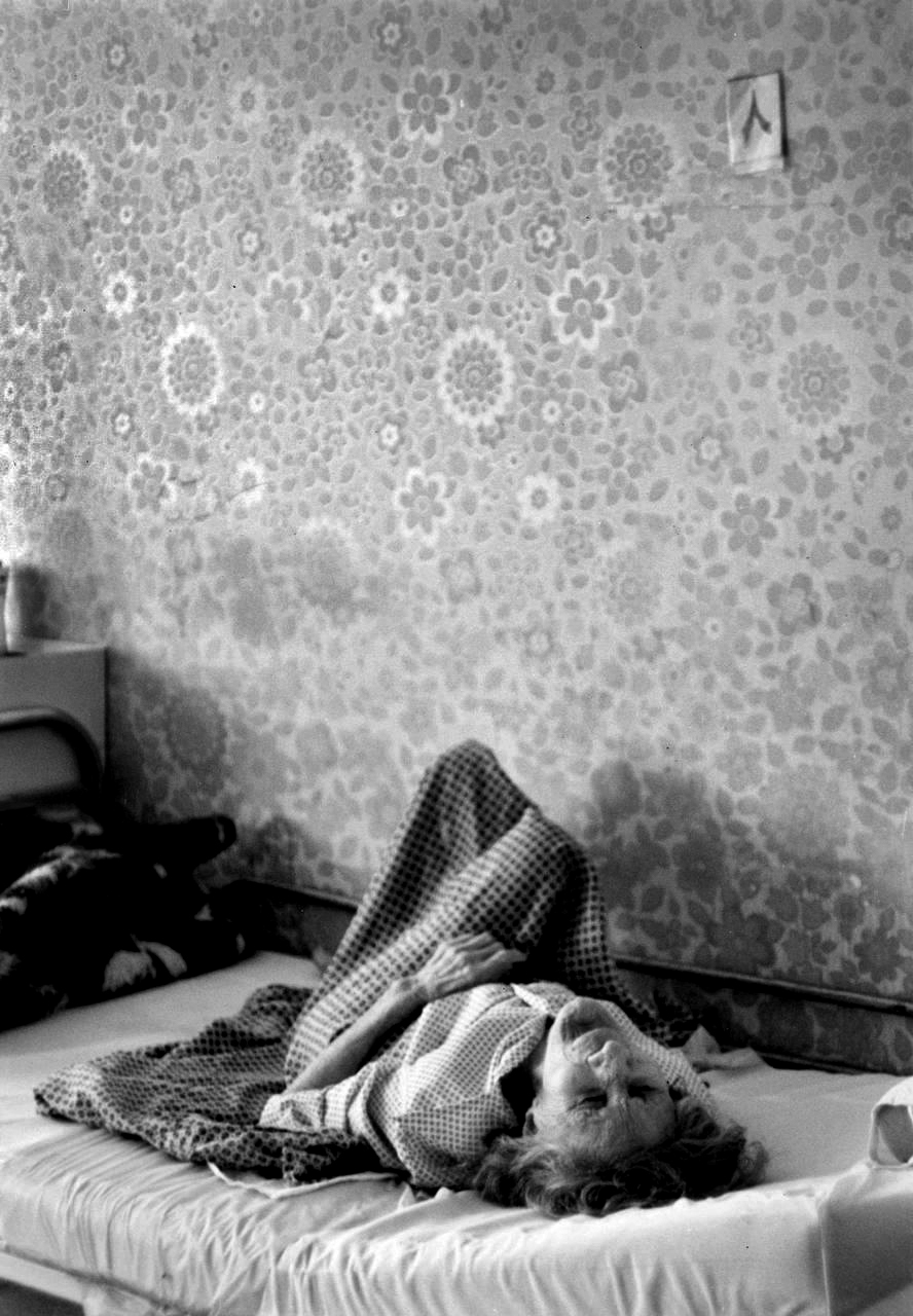چنان اندامِ نحیفِ زن مُچاله گشته است، که تخت برای جثهٔ ریزِ وی، بزرگ جلوه می کند.